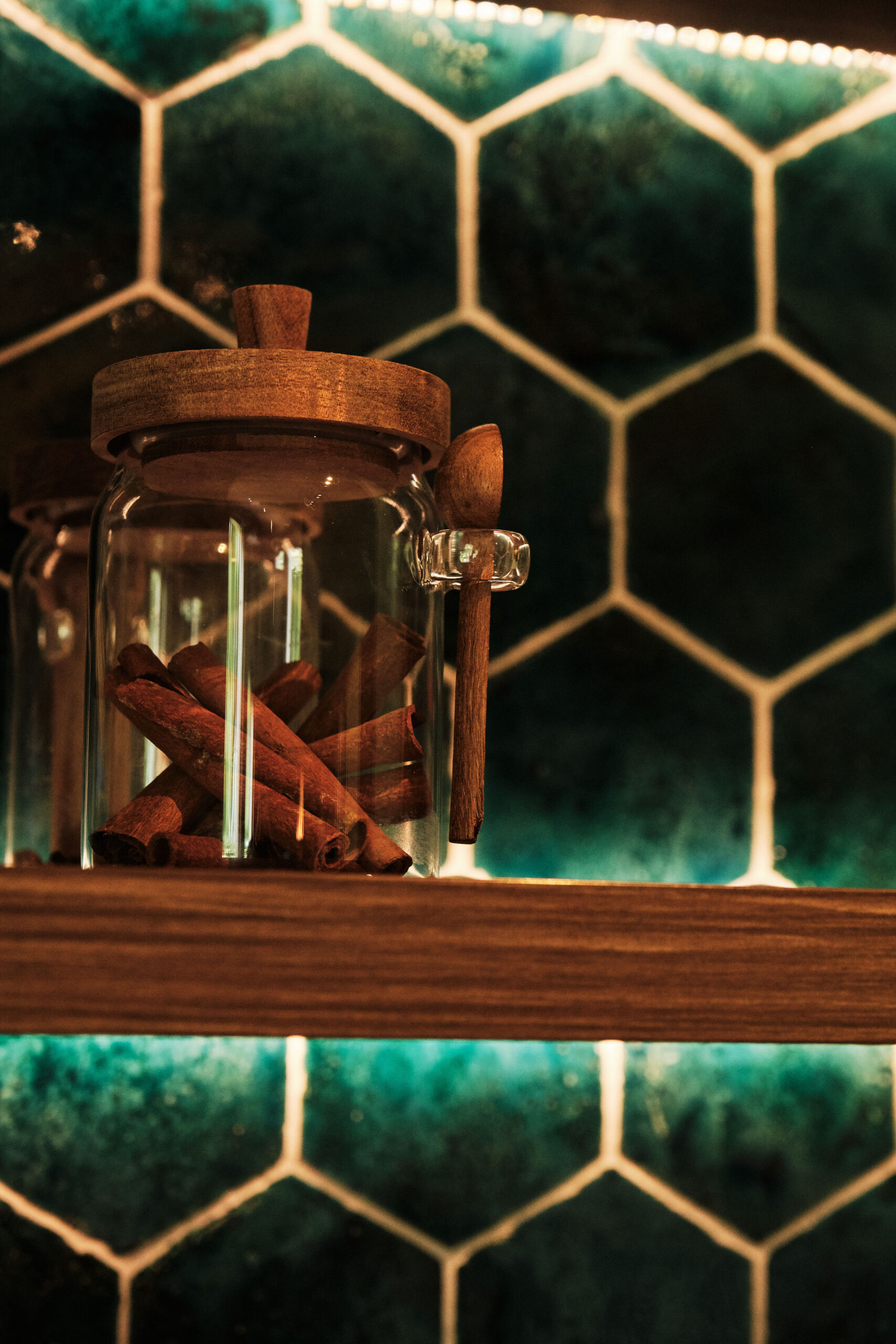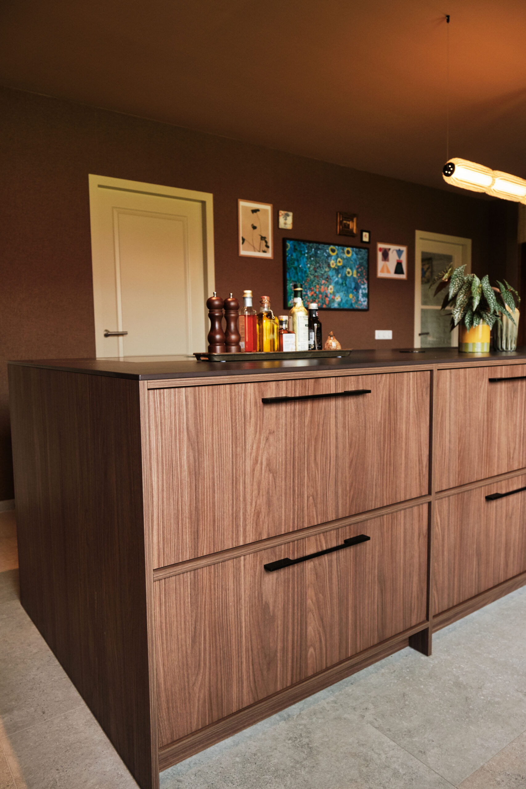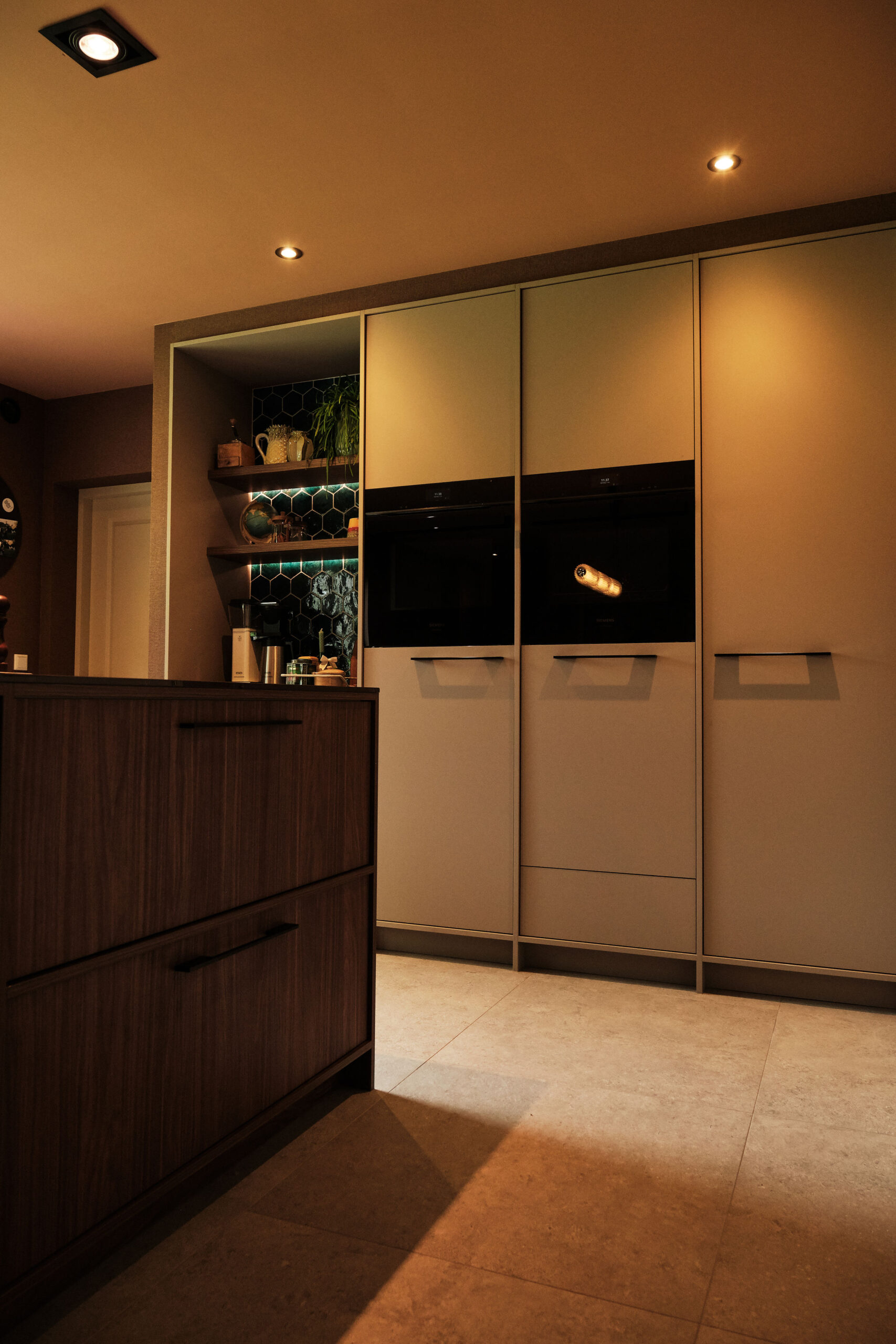 De keuken straalt rust en verfijning uit door de tweekleurige combinatie van warme houttinten en matte effen fronten. De open schappen met sfeervolle verlichting en een accentwand met zeshoekige tegels zorgen voor een subtiel Japandi-accent: functioneel, minimalistisch en toch uitnodigend.