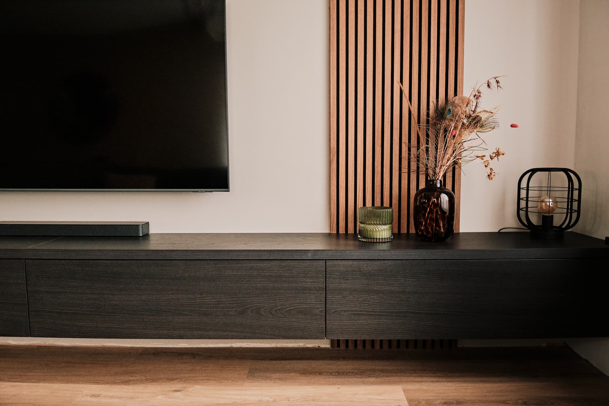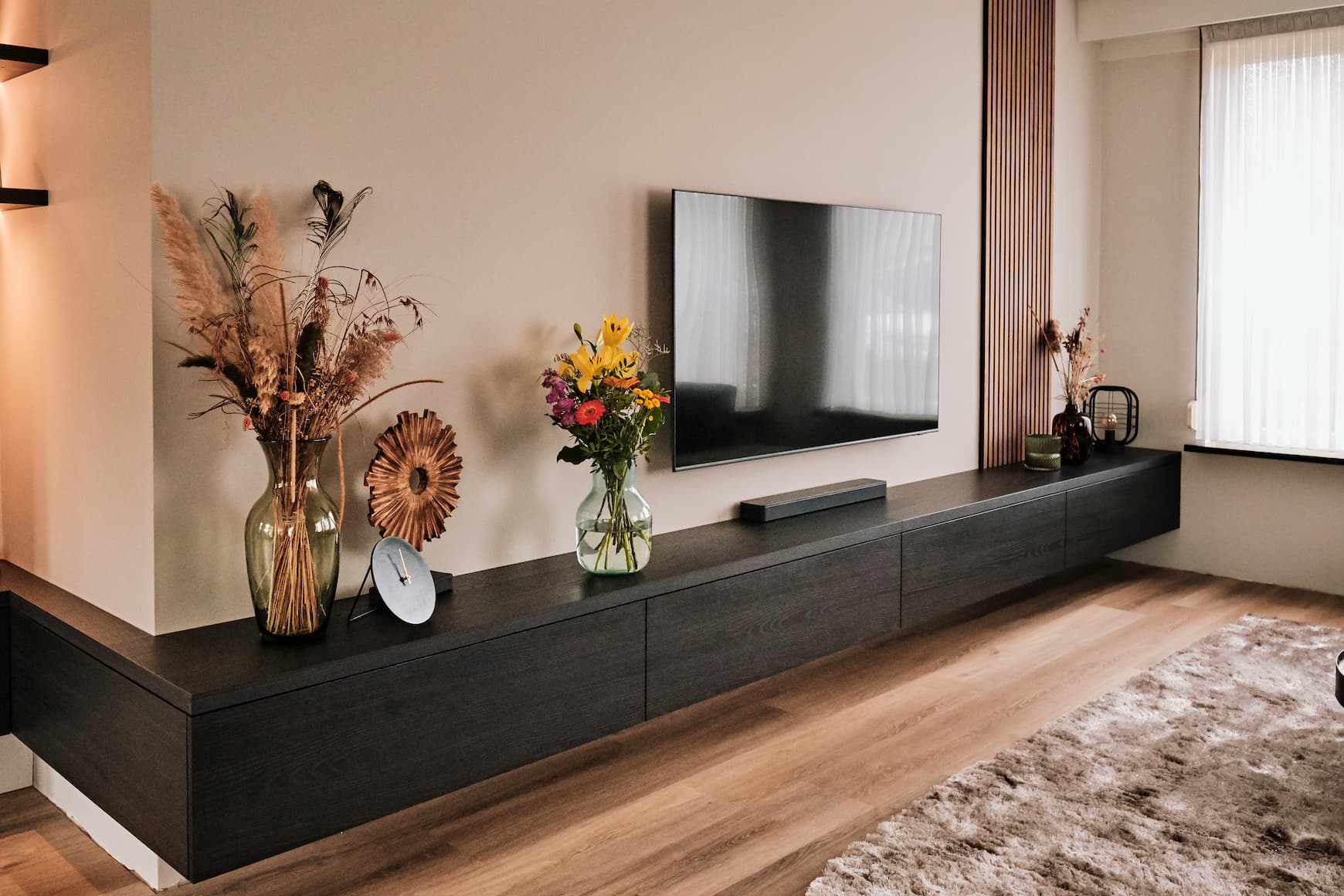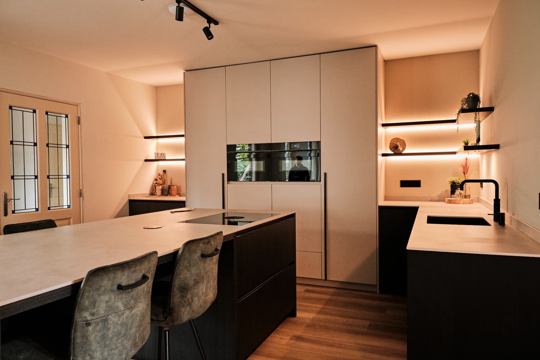 Voor dit project kozen we warme Corteccia-fronten van Decolegno (S176) in combinatie met kasjmiergrijs van Egger (U702 ST9). Het werkblad in Dekton Argentium geeft de keuken een luxe en robuuste uitstraling. Dankzij de greeploze afwerking, greeplijsten en tip-on systemen oogt het geheel strak en modern. Indirecte verlichting zorgt voor sfeer.